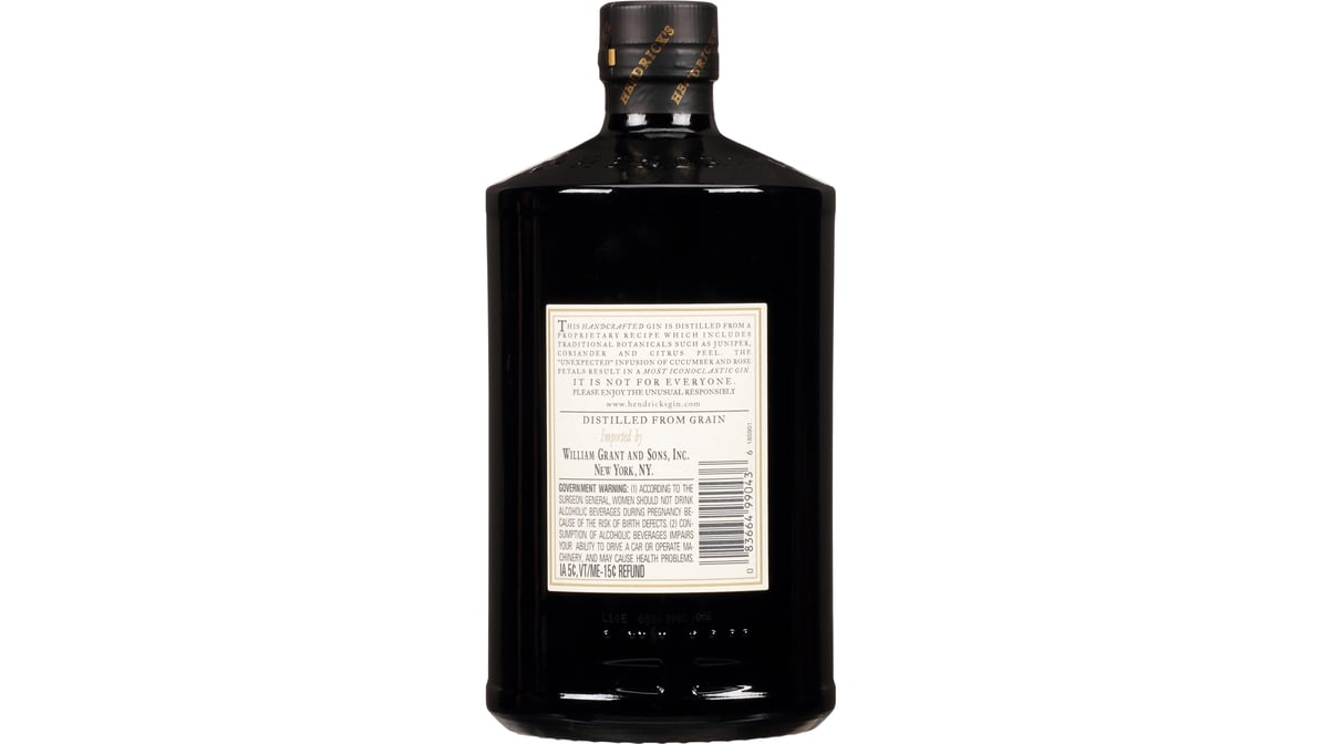 Hendrick’s is an unusual gin created from eleven fine botanicals. The curious, yet marvelous, infusions of rose & cucumber imbue our spirit with its uniquely balanced flavor resulting in an unimpeachably smooth and distinct gin. The Hendrick?s Rickey is a beloved, refreshing and easy-to-make cocktail. However, Ms. Lesley Gracie, chooses to drink it with club soda, elderflower liqueur and garnished with 3 thinly sliced cucumber rounds. Hand-crafted on the Southwest coast of Scotland in the decidedly un-ginnish town of Girvan, tiny batches of only 500 lovely litres are produced at a time, which gives Ms. Lesley Gracie, our Master Distiller and the inventor of Hendrick?s Gin, greater control of her careful artistry. Hendrick?s Gin is created via an absurdly inefficient, yet quite glorious process. In essence, to make one gin, we first create two. One on an old-fashioned pot still, yielding a rich and intricate spirit. The other on along-necked Carter Head, producing a delicate, more refined spirit. Each still is infused with an unusual symphony of 11 botanicals. The gins from the two stills are then married together and graced with refreshing infusions of Rose and Cucumber. This odd method of making gin enables Hendrick?s to taste light, yet intriguingly complex. The result is a wondrously refreshing gin with a delightfully floral aroma, elevating any cocktail and all occasions. Escape the conventional, and embrace the delectable. Please enjoy the unusual responsibly.